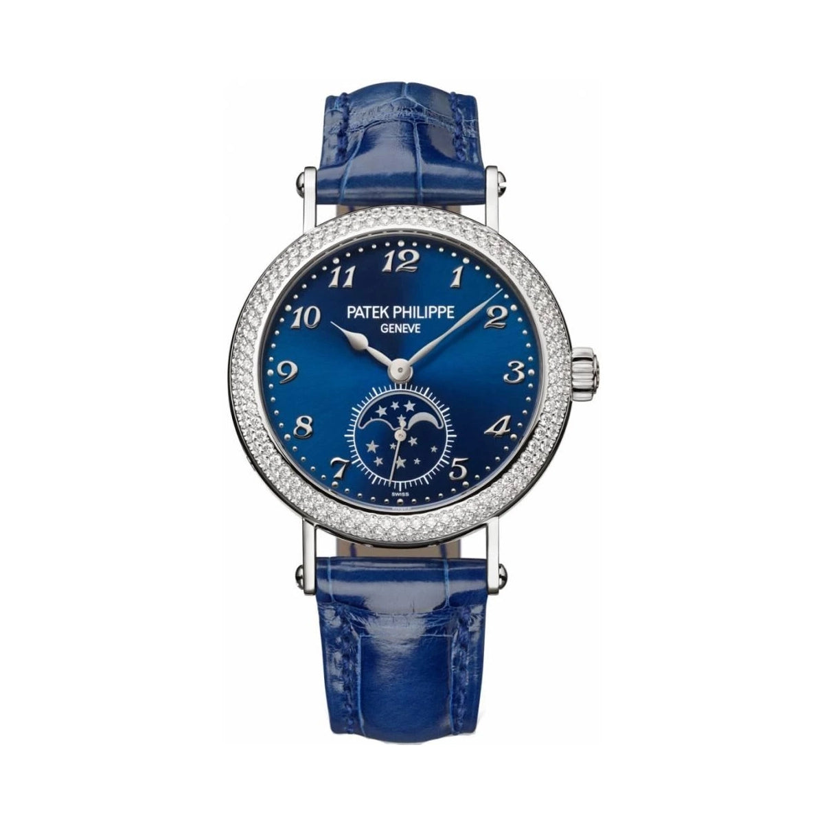 Complications Blue Sunburst Dial Moon Phase Diamond Set Bezel